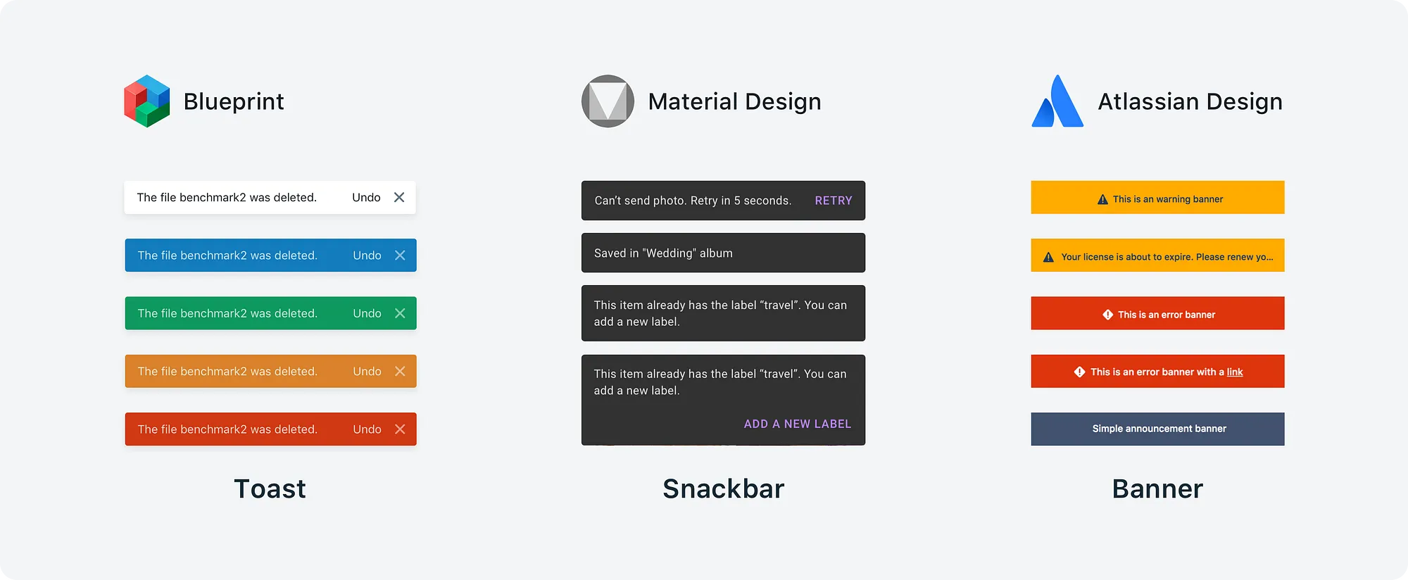| 사용 목적 | 컨텍스트가 있는 작업 피드백 제공. 예: "저장되었습니다. [실행 취소]" | 단순 피드백 제공. 예: "복사되었습니다." |